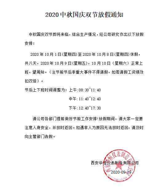 2020年10月1日(星期四)至2020年10月8日(星期四)休假,共八天,2020年10月9日(星期五)、10月10日(星期六)正常上班,望周知。(注,節前節后非重大事件不得請假,如若請假工資績效扣雙倍)。
