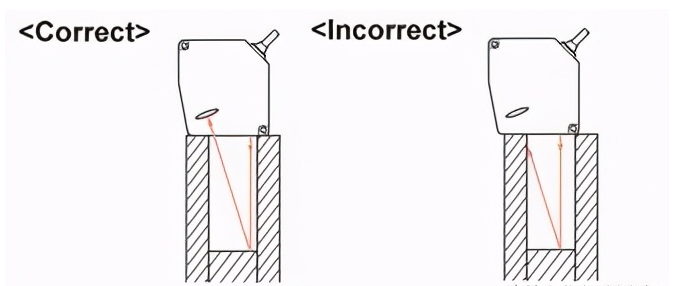 如下所示安裝傳感器,以防止多束反射光線進入墻壁上的接收部分。另外,在壁的反射率高的情況下,使用非光澤的黑色壁是有效的。