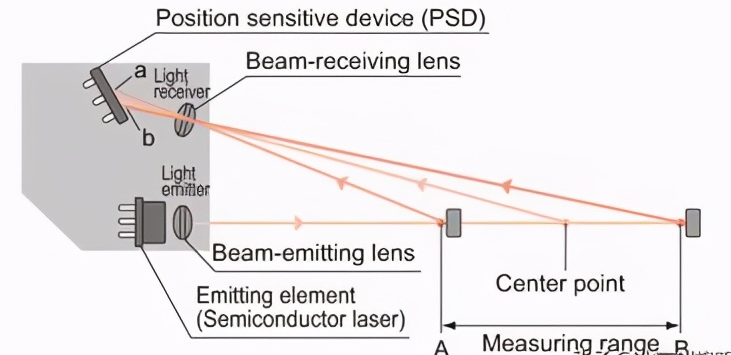 激光位移傳感器測距的原理,其中一種方法是通過組合發射元件和位置敏感器件(PSD)進行三角測量以執行測距(檢測位移量)。