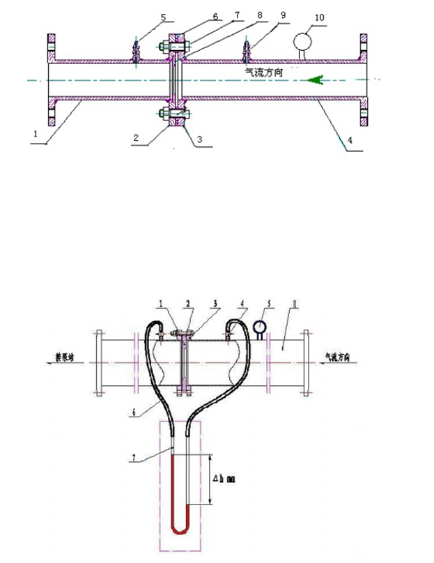 7、U型管壓差計; 8、鋼管孔板流量計結構原理圖