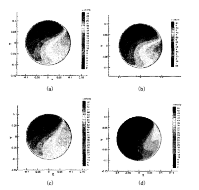 蒸汽流量分別為10t /h、24. 9t /h、58t /h 和83t /h時,直管段1. 2m 處蒸汽流場分布如圖3 所示。