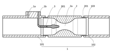 其中,1為主管段;101為進口管段;102為出口管段;103為環形插槽;1a為高壓取壓口;1b為低壓取壓口;2為喉口管段;201為環形插頭;2a為喉口;3為喉口取壓管;301為水滴形結構。