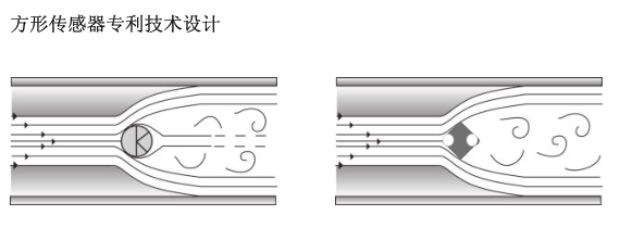 方形傳感器的外形以及其完好定義的邊緣和外部充壓管對所有液體和氣體造成一個固定流體分隔點保證了最佳的測量精度而不依賴于雷諾數及流量系列的方形傳感器是其性能的關鍵它不同于簡單的圓形傳感器圓形傳感器的流體分隔點會隨雷諾數流量發生變化從而導致測量精度的不確定性。