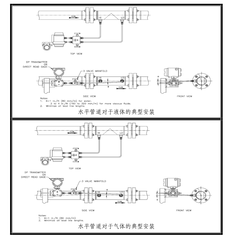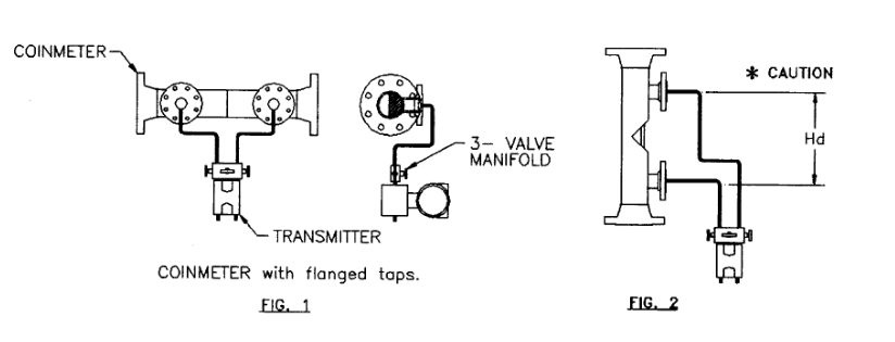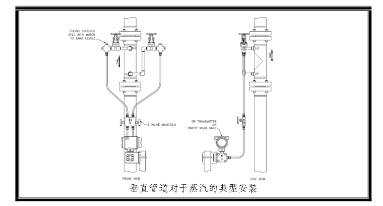對于楔式流量計的垂直安裝方式,在變送器的調零過程中一定要考慮可能會產生的靜壓頭效果。楔式流量計與變送器之間的引壓管最小應為3/8''管。(如FIG.2)變送器的調零過程中建議應用三閥組。