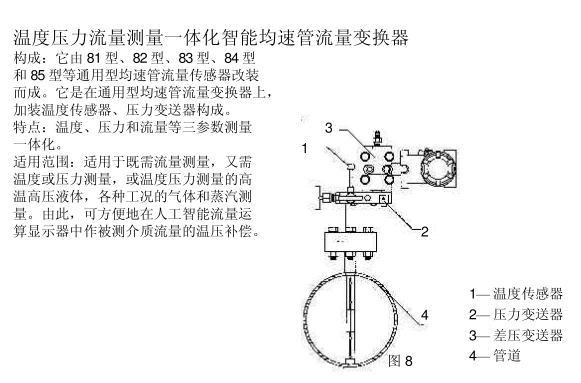 溫度壓力流量測量一體化智能均速管流量變換器構成:它由 81型、82型、83型、84型和 85型等通用型均速管流量傳感器改裝而成。它是在通用型均速管流量變換器上加裝溫度傳感器、壓力變送器構成。