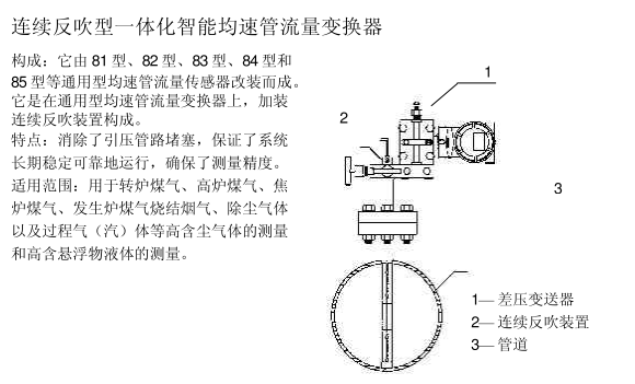 它是在通用型均速管流量變換器上,加裝連續反吹裝置構成。