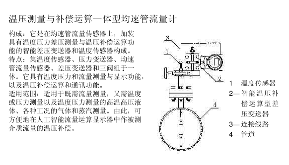 溫壓測量與補償運算一體型均速管流量計構成:它是在均速管流量傳感器上,加裝具有溫度壓力差壓測量與溫壓補償運算功能的智能差壓變送器和溫度傳感器構成。