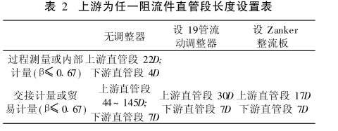 在無流動調整器情況下,孔板流量計的直徑比、值小于等于067,且滿足孔板上游為任意阻流件時,孔板上游直管段長度按規定至少應有44D,在阻流件為特殊復雜管路或匯管時,上游直管段長度可能需要60~145D。如此長的直管段會增大站場面積,增加安裝難度,不利于工程費用的降低和實施,見表2。
