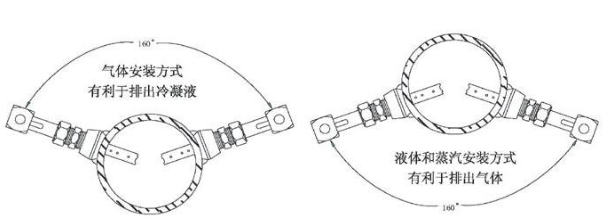 方向同氣體,在管道上方。測量蒸汽時我們只推薦傳感器安裝在管道下方160度內,并且要使傳感器處于整個測量裝置的最高點,若有特殊場合的安裝方式請與我們聯系。