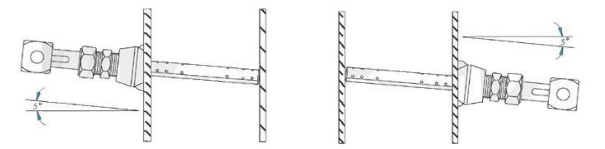 對于垂直管道,理論上可以在360度內安裝。對于含有大量水分的濕氣體,推薦傳感器安裝時向上傾斜5度,對于含有大量氣體的液體,推薦傳感器安裝時向下傾斜5度(見上圖)。且傳感器應該處于整個測量系統中的最高點,若有特殊場合的安裝方式請與我們聯系。