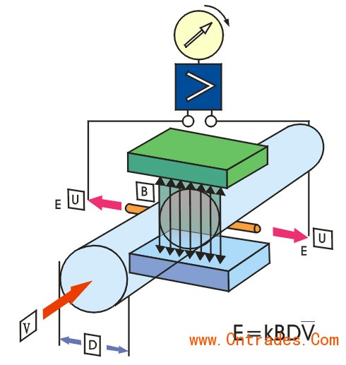 電磁流量計是是基于法拉第電磁感應定律工作的,在與測量管道軸線和磁力線相垂直的管壁上安裝了一對檢測電極,當導電液體沿著管道軸線流動時,導電液體切割磁力線產生感應電勢,此感應電勢由兩個檢測電極檢出,數值大小與流量成正比關系,其計算公式為: