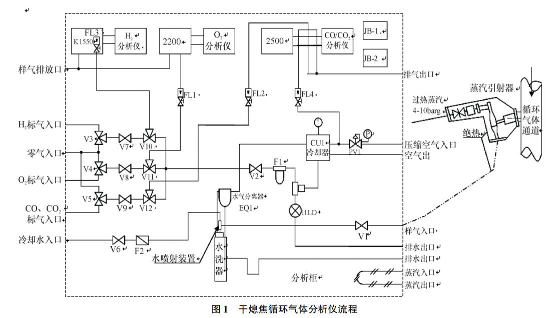 在干熄焦工藝中,惰性氣體大多采用 N2,隨著循環過程的進行,循環氣體中的 H2 和 CO 成分逐漸增多,并很快形成了由 H2、CO 等組成的爆炸性氣體。正常生產時,循環系統中的 O2 含量較低,不會引起爆炸,但當設備出現泄漏點或是在循環風機停止運轉時,有空氣進入就會發生危險。因此,及時、準確地檢測循環氣體中 O2、CO、H2、CO2 的濃度,對保證干熄焦工藝安全生產有重大意義。干熄焦系統循環氣體中 H2、CO、CO2、O2 等微量氣體的含量是通過標準孔板流量計進行檢測的,故循環氣體成分分析與操作控制是保證干熄爐安全生產的關鍵。