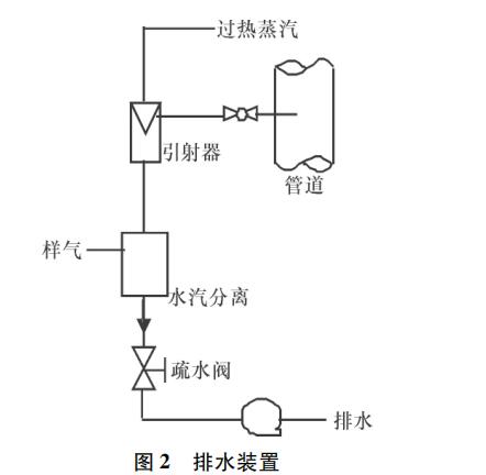 在蒸汽引射器后面加裝一個水汽分離器,如圖2,樣氣蒸汽混合汽中的大部分水分在此分離并由下方疏水閥自動排出,氣體由上方流出,效果是減少樣氣的含水量。